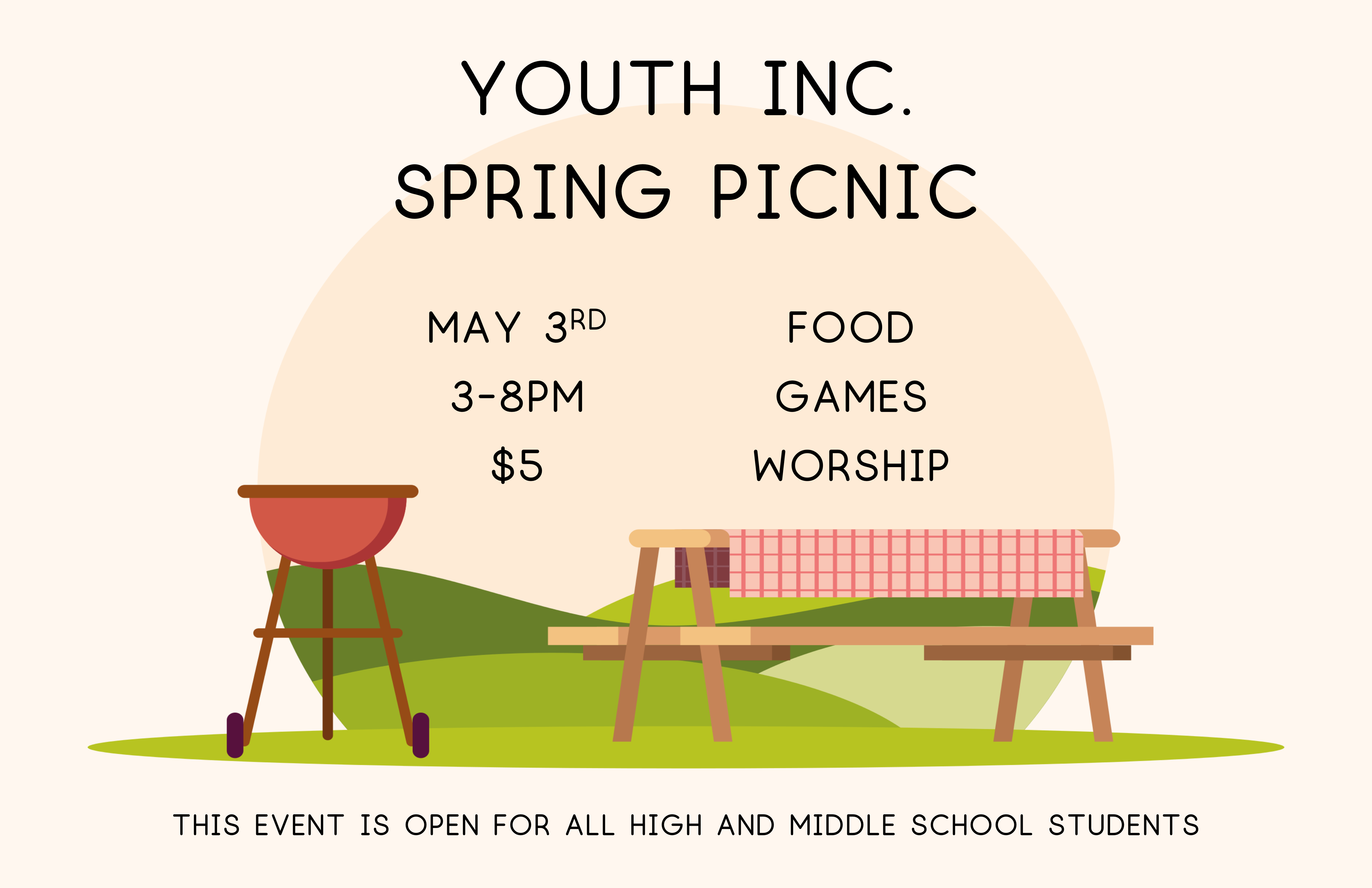 Youth Inc. is hosting a Spring Picnic on May 3rd at Triad Park! This will be a fun evening of games, food, and fellowship with other youth groups from the area. The cost is $5. We will leave Jefferson at 3 pm and will return by 8 pm.